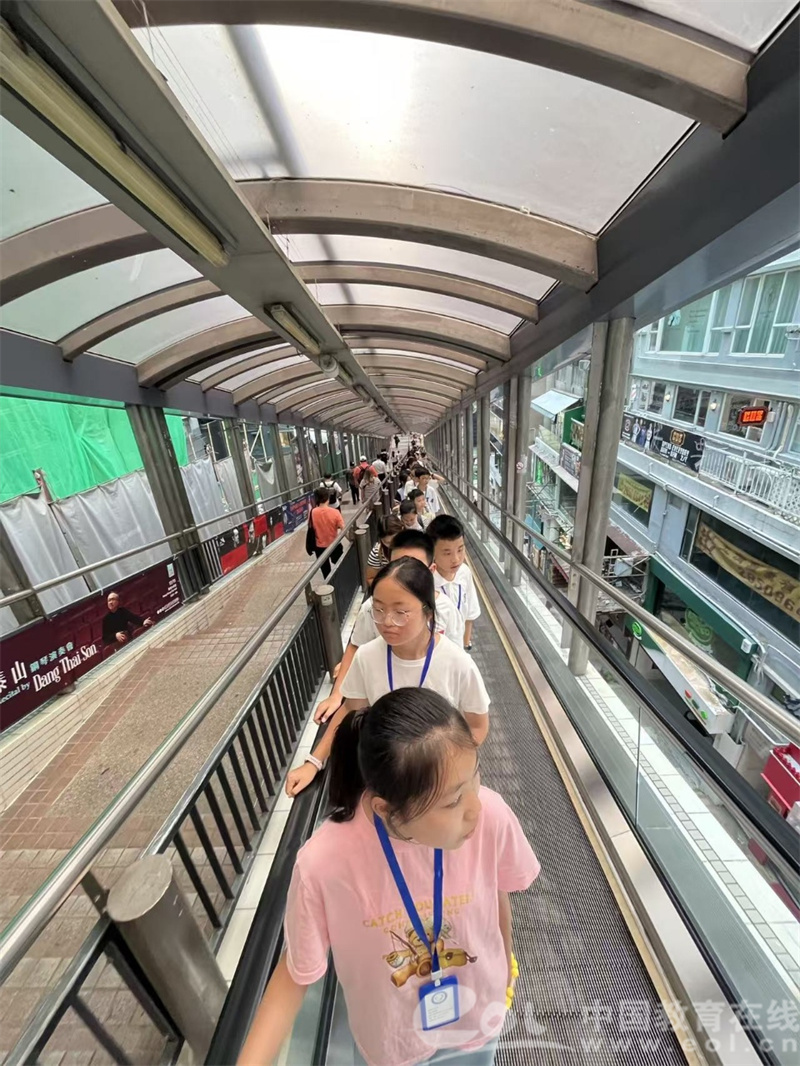 接着,师生一行来到中环半山扶梯。从底层踏上这世界最长的半自动扶梯一路缓缓向上,仿佛穿越了香港的市井与繁华。扶梯两旁的小店散发着独特的氛围感,居民楼近在咫尺,还能瞥见住户日常的生活场景,很是有趣。随着扶梯攀升,20多分钟的路程竟也不觉得漫长,偶尔回头,还会因高度生出一丝恐高的小紧张。此刻,同学们也仿佛走进了电影场景,这种现实与艺术的交织,让这段扶梯之旅充满了文艺的浪漫。