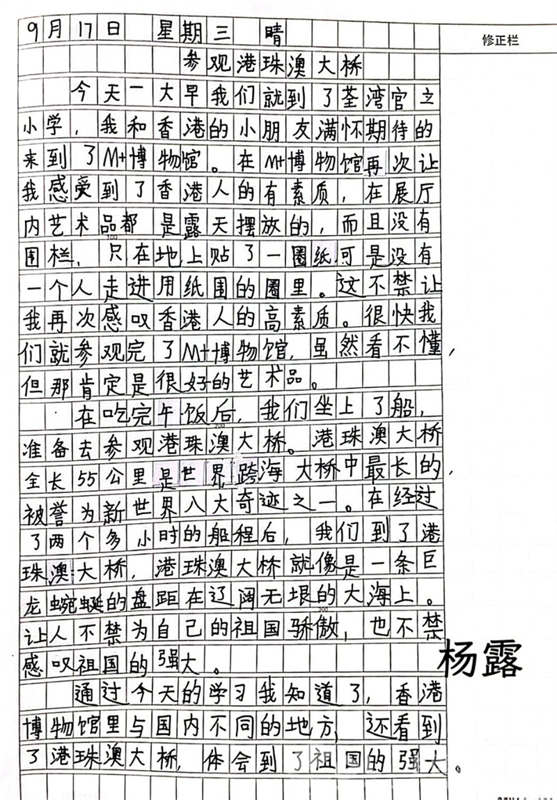 同学们乘船出海,近距离观赏港珠澳大桥。途中,导游向大家介绍:港珠澳大桥不仅是世界总体跨度最长、钢结构桥体最长、海底沉管隧道最长的跨海大桥,还拥有世界最长的公路沉管隧道与唯一的深埋沉管隧道,设计使用寿命达120年。此外,港珠澳大桥创造了100万立方米混凝土浇筑不开裂的纪录,形成了海上人工岛、深埋沉管隧道等五大创新技术群,共申请专利454项。经过两个小时的航行,一行人终于靠近大桥。只见它如一条巨龙般横卧在伶仃洋上,令人惊叹不已。大家激动地欢呼起来,心中满是自豪——这是中国的骄傲!那一刻,“为建设祖国更加努力学习”的愿望在我们心中愈发强烈。