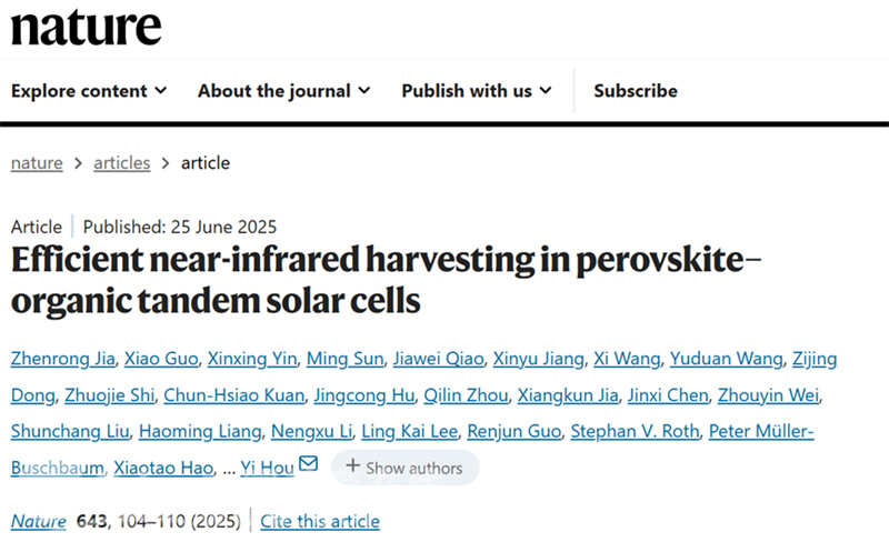 中国教育在线浙江站讯 (记者 陈显婷 通讯员 周清)近日,嘉兴大学生物与化学工程学院李在房教授团队尹新星博士在国际顶级学术期刊《Nature》发表了题为《Efficient near-infrared harvesting in perovskite–organic tandem solar cells》的研究论文。嘉兴大学尹新星博士为该论文共同第一作者,新加坡国立大学侯毅教授为该论文的通讯作者。