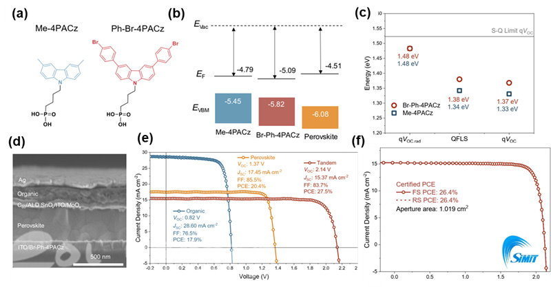 研究团队基于前期成果(Nat. Photon. 2024, 18, 1269),在本研究工作中,通过SAM末端溴的引入实现了宽带隙钙钛矿子电池的精准能级匹配和相分离抑制。基于所开发的Ph-Br-4PACz分子,钙钛矿薄膜荧光量子产率提升4倍(达1.82%),准费米能级分裂推算的开路电压(iVOC)达1.38 V。单结器件VOC达1.37 V,FF高达85.5%,效率突破20.4%。更关键的是,该设计显著抑制光照下的卤化物相分离,器件在85%湿度下MPPT工作寿命延长至550小时。结合有机子电池的不对称受体设计,一举将钙钛矿-有机叠层电池的效率突破到了26.4%(1 cm2认证值),创造了新的世界纪录,为柔性光伏产业化开辟新路径。