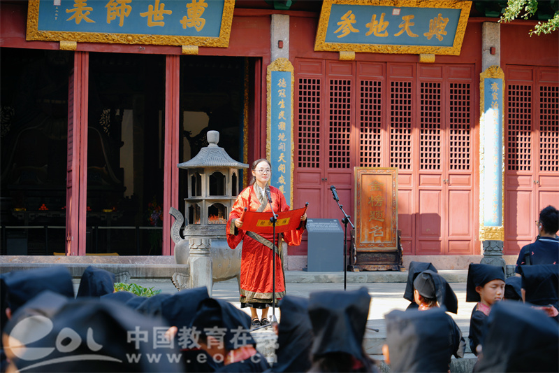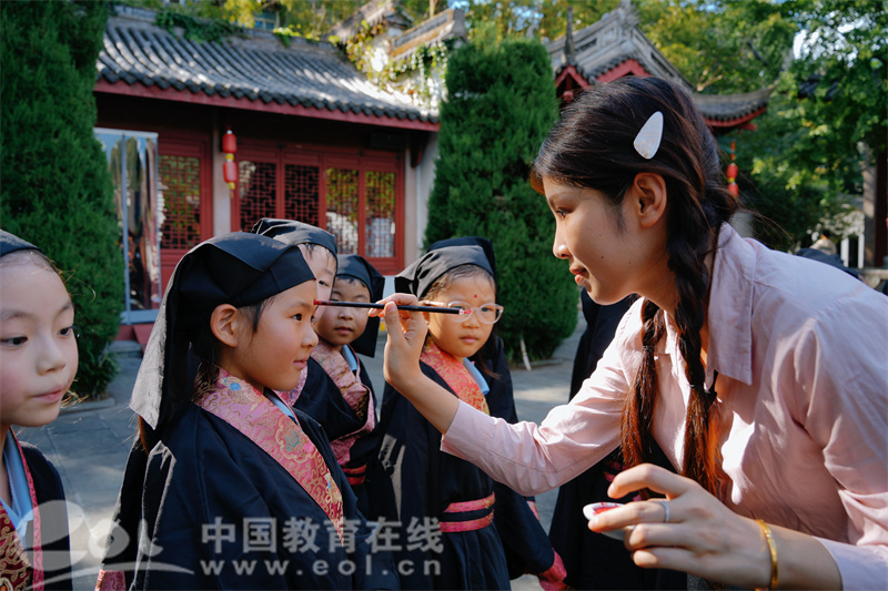 活动现场,孩子们身着传统汉服,在师长们的引领下,依次完成了“正衣冠”“朱砂启智”“诵读经典”等环节。整个仪式古朴而温馨,孩子们在肃穆的氛围中亲身感受中华礼仪之邦的尊师重道之风,体会求学求知的神圣与庄严。