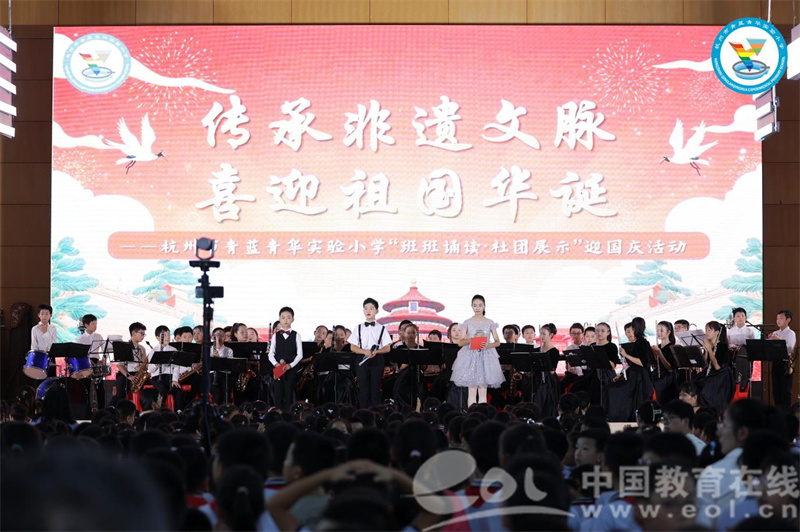 中国教育在线浙江站讯 (编辑 鲁少辛 通讯员 叶丽)2025年是首个非遗文化年。它意在保护与传承非物质文化遗产,增强公众文化认同,同时推动非遗与现代社会融合,实现文化传承与社会发展的互动。值此之际,杭州市青蓝青华实验小学迎来第七届“班班诵读·社团展示”迎国庆活动。这场以“非遗”为核心的文化盛宴,从吴越大地的匠心传承到浙江全域的文化瑰宝,再到西湖之畔的绸伞雅韵,层层铺展非遗文化的千年脉络,用少年之声奏响文化传承与爱国情怀的交响。