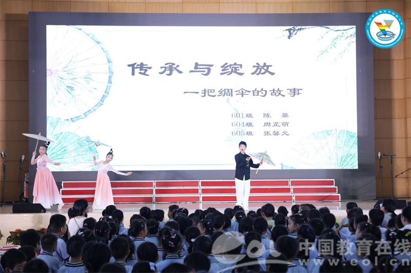 在众多非遗元素中,杭州西湖绸伞作为地域文化符号,成为活动的点睛之笔。而六年级组《一把绸伞的故事》更是将这份韵味推向深层。孩子们以非遗课程的亲身经历为蓝本,讲述绸伞制作的繁复工序与文化内涵——从竹骨选材到伞面绘制,从桐油涂刷到穿线缀边,每一步都凝结着匠人的坚守。舞台上,绸伞开合间,既映照着西湖的湖光山色,也见证着非遗文化在校园中的传承足迹。