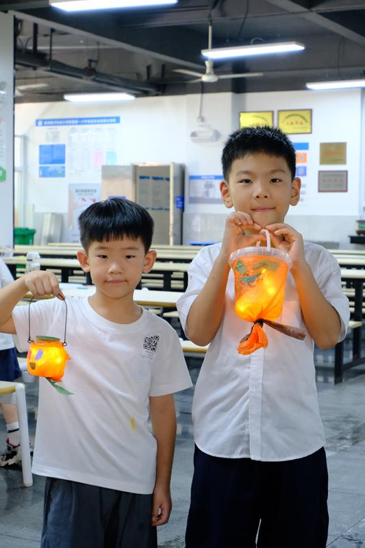 月饼区是香甜的,灯笼工坊是天马行空的。兔子灯、月亮灯只是基础模板,孩子们制作的灯笼充满了创意。