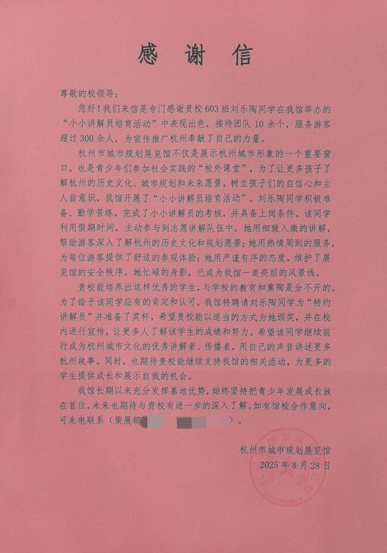 中国教育在线浙江站讯(编辑 邱彬鑫 通讯员 孙佳燕)近日,杭州市澎汇小学校长收到了一封来自杭州市城市规划展览馆的感谢信。信中高度赞扬了603班刘乐陶同学在杭州市城市规划展览馆举办的“小小讲解员培育活动”中的出色表现。据悉,刘乐陶同学在活动期间共接待团队10余个,服务游客超过300人次,以自信专业的讲解和热情大方的态度为宣传推广杭州城市形象贡献了自己的力量。