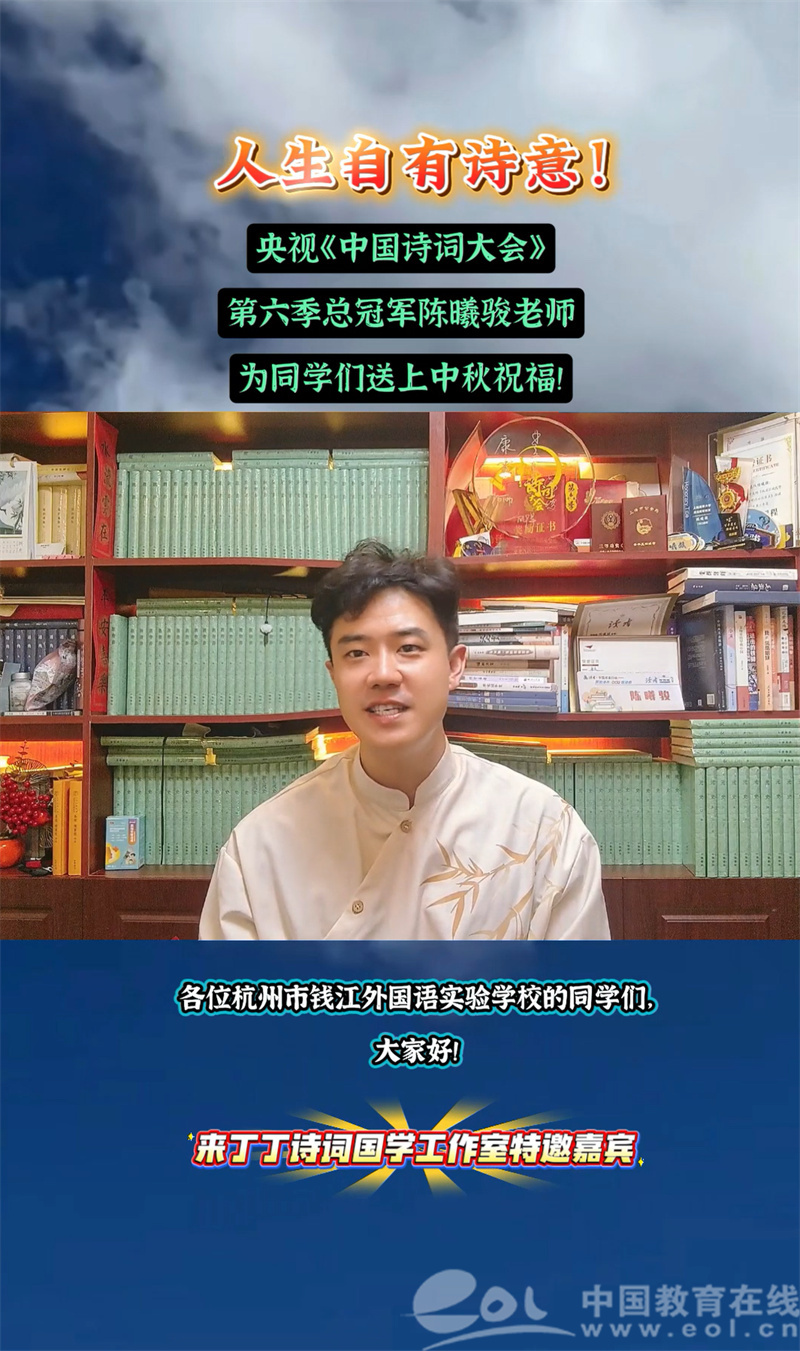 中国教育在线浙江站讯 (编辑 鲁少辛 通讯员 李芷逸)2025年中秋节来临之际,在杭州市钱江外国语实验学校的“来丁丁诗词国学工作室”内,朗朗的诵读声与千年诗韵相互交织。2024全国 “新时代好少年”来丁丁带领工作室成员,与央视《中国诗词大会》第六季总冠军陈曦骏进行“云端联动”,以11首经典中秋诗词为线索,探寻中华传统文化的“中秋密码”。