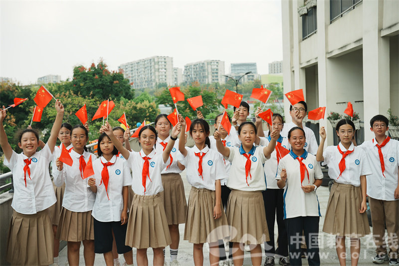 整齐的脚步声回荡在校园,各班学生在班主任的带领下有序入场。洁白的衬衫、鲜红的领巾、闪耀的团徽,与手中挥动的小国旗交相辉映。走廊窗台、广场四周,“中国红”如星火燎原,处处涌动着青春的热忱与对祖国的热爱。一张张青春的笑脸,一句句轻声哼唱的旋律,让整个现场洋溢着庄重而热烈的节日氛围。