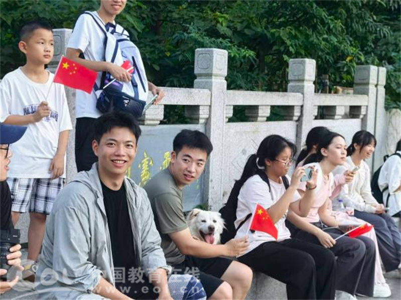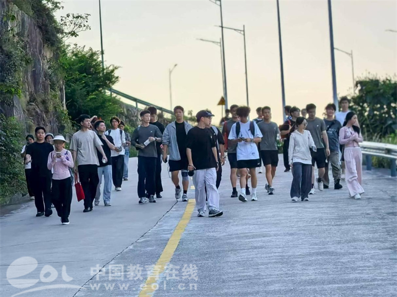 登山当天,退役大学生士兵、各族学生代表齐聚大罗山脚下,沿着蜿蜒山道拾级而上。途中,大家互相分享着军旅故事与民族风俗。抵达休息站点时,学院教师为学生们分发月饼。大家也围坐在一起,唱响《强军战歌》等红色歌曲,“听吧,新征程号角吹响,强军目标召唤在前方……”激昂的旋律回荡在山林间。