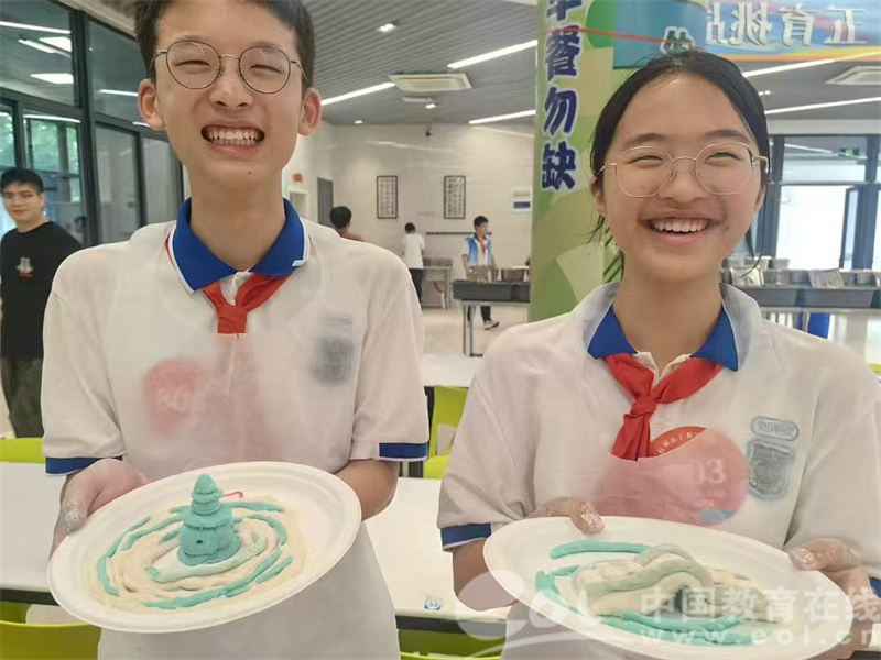 二楼餐厅是劳育实践的“主战场”,这里的每一场挑战都充满生活气息与创意火花。“面团大作战”中,原本普通的面粉与清水,在同学们的手中被赋予了生命:有的揉出竖耳探头的小兔,有的捏出振翅欲飞的蝴蝶,憨态可掬的大鹅造型更是引得围观同学频频拍照。“老师,帮我调整下鹅的脖子呗!”“咱们借点隔壁的小番茄当装饰,肯定更亮眼!”互助声、讨论声此起彼伏,当一件件“面食艺术品”端上桌,面粉的清香里满是劳动的成就感。