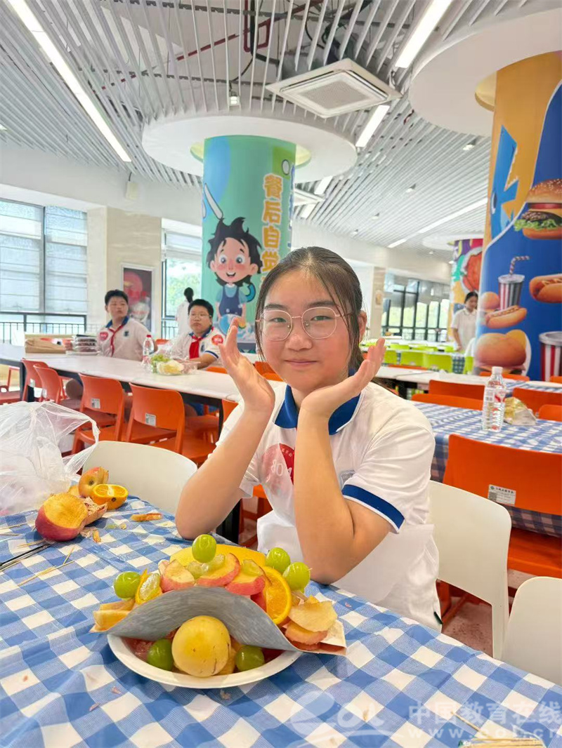 “水果拼盘大比拼”则将劳动与美育、德育巧妙融合。餐厅的“创意展台”上,黄瓜与石榴拼出“梅枝映日”的诗意,猕猴桃与橘子组合成呆萌的猫头鹰,最令人动容的是用石榴籽排布的“五星红旗”——鲜红的籽粒如星火般汇聚,既展现了劳动巧思,更传递出少年炽热的爱国心。而“快手剥壳大赛”里,“你剥鹌鹑蛋我剥蒜”的分工、“顺着纹路快扒皮”的技巧分享,让同学们在与时间的赛跑中,体会到协作劳动的高效与快乐。
