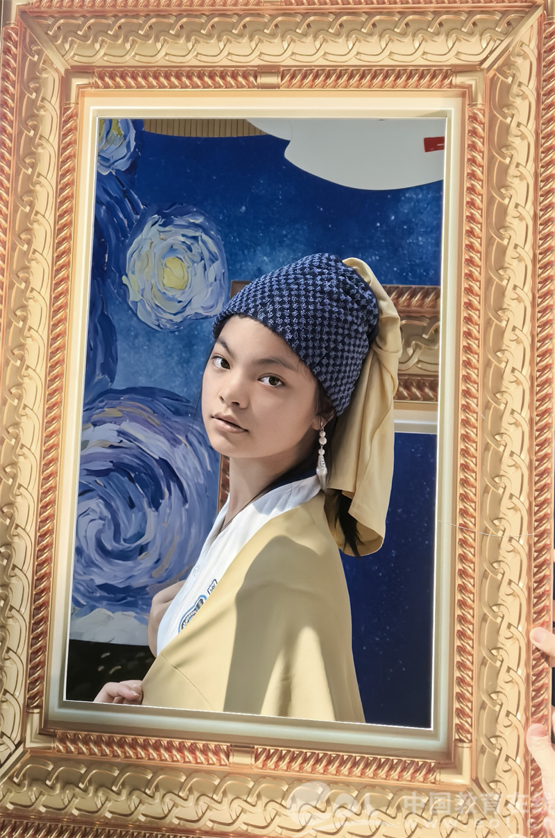 三楼风雨操场的美育板块,打破了传统艺术教育的边界,让经典与创意在青少年身上碰撞出奇妙火花。“一秒‘入画’——经典画面模仿秀”前,同学们化身“行走的名画”:有人轻托下巴,复刻《蒙娜丽莎》的神秘微笑;有人头戴自制珍珠耳环,还原《戴珍珠耳环的少女》的温婉;还有同学穿上朴素外套,演绎画作中“父亲”的厚重与沧桑。原本挂在美术馆墙上的经典作品,此刻成了同学们可模仿、可演绎的鲜活体验,让美育不再遥远。