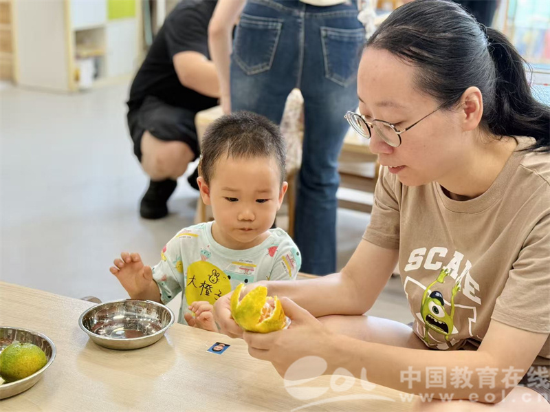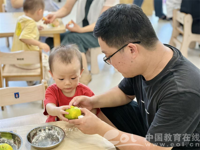 中途休憩时光,幼儿园将“能量补给”与“习惯培养”巧妙结合,为每位宝贝准备了可口的小饼干与秋日水果。小宝贝们在家长陪伴下清洗小手,在看一看、闻一闻、剥一剥、尝一尝的过程中感受橘子的特点,不仅补充了能量,还培养了良好的生活习惯。品尝时,老师还引导宝贝们将美味分享给爸爸妈妈,让亲子间的情感在分享与陪伴中更加深厚。