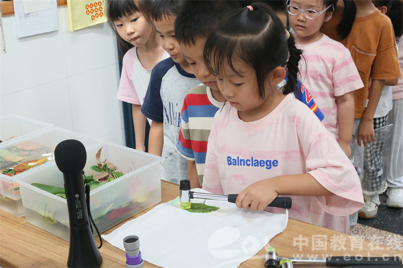 孩子们将树叶轻轻覆于布上,用小锤子认真敲打,在此起彼伏的“砰、砰”声中,植物的形状和色彩便神奇地留在了手帕上。原来,这是植物细胞破壁后,色素慢慢释放、氧化的结果。看着自己做出的独一无二的作品,每个孩子脸上都洋溢着创造者的骄傲。
