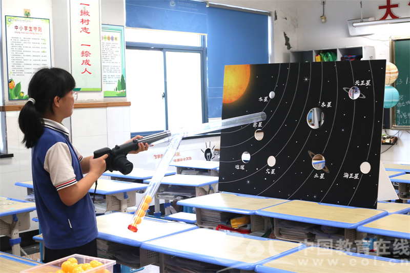 “嗖——嘭!”乒乓球从发射器呼啸而出,划出完美弧线。这个“星际发射”同样利用“伯努利原理”。风枪喷出的高速气流中心压强小,周围静止空气的压强大,便将乒乓球推向了气流中心。每一次成功发射,都引来全场沸腾,仿佛真的点燃了孩子们的航天梦。