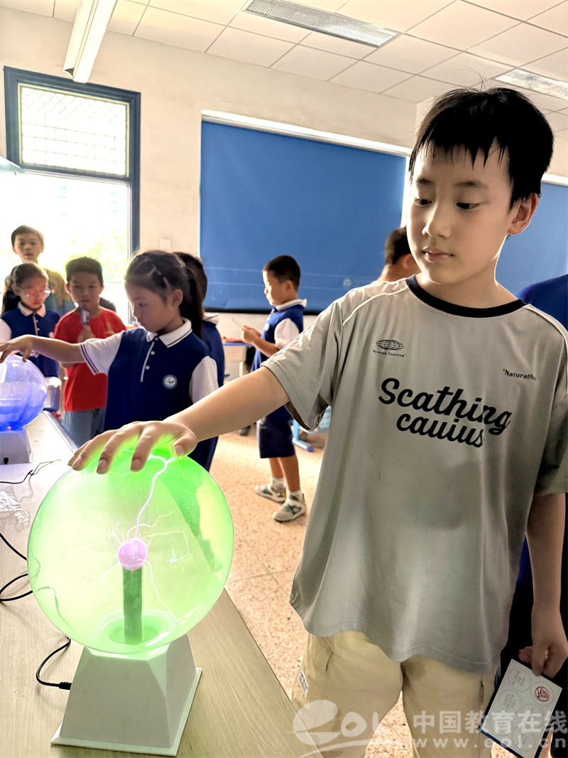 当一双双小手轻轻贴上玻璃球面时,一道绚丽的紫色流光瞬间被吸引过来,仿佛被赋予了魔法。老师讲解说,这是因为球内的气体被电离,形成了能导电的等离子体。孩子们恍然大悟,争相触摸,在一声声惊叹中感受电光在指尖起舞的神奇。