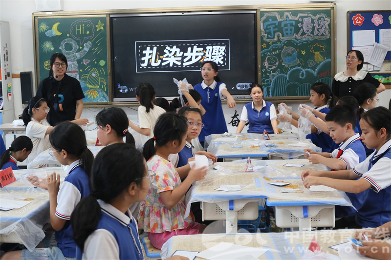 扎染是一种古老的手工印染技艺,不同的扎结方式会形成各具特色的纹理图案。当白布在孩子们手中被皮筋扎成各种形状,浸入染料后再展开,就像开启一个个色彩盲盒。最后展示作品时,意想不到的图案引得大家连连惊呼:“太漂亮了!”