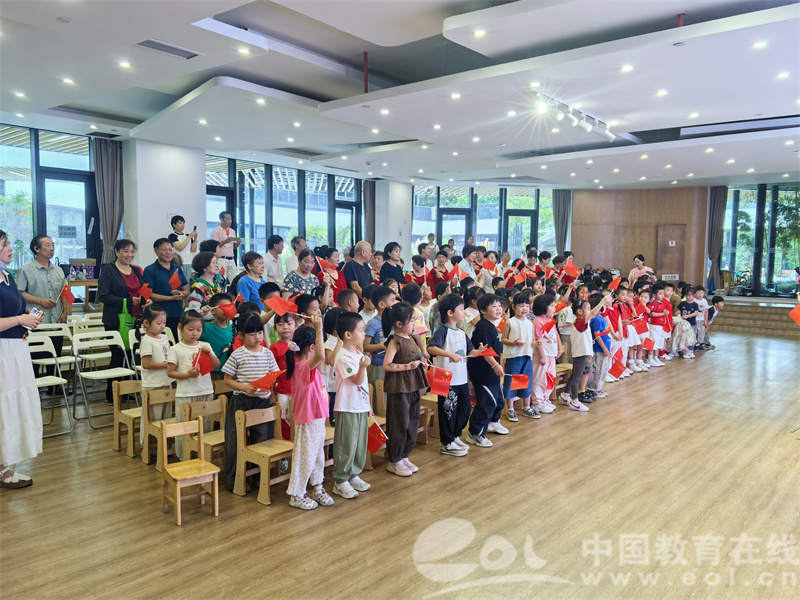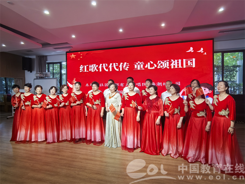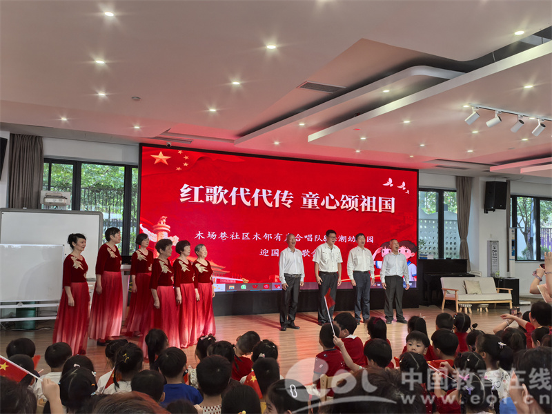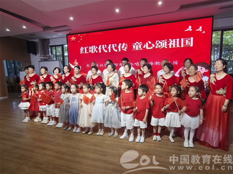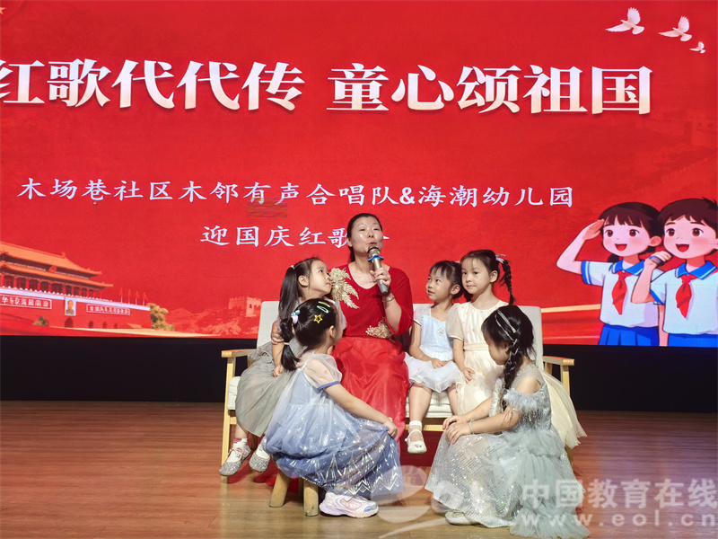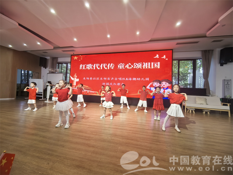 中国教育在线浙江站讯 金秋送爽,丹桂飘香。国庆节到来之际,为弘扬爱国主义精神,传承红色基因,杭州市海潮幼儿园与木场巷社区木邻有声合唱队联合举办了“红歌代代传,童心颂祖国”迎国庆红歌会活动。活动现场歌声嘹亮、红旗飘扬,人们在这里,以音乐为纽带,共同回顾峥嵘岁月,抒发对祖国的深情礼赞。