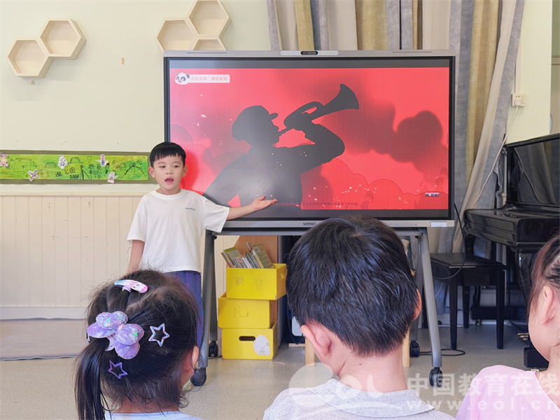 国庆主题活动同样精彩纷呈。听,中大班的哥哥姐姐在讲红色故事呢。小班孩子围坐在一起,聆听老师讲述小英雄的故事;中大班孩子则走上“故事小讲台”,与同伴分享《小兵张嘎》《鸡毛信》等经典绘本,语言虽稚嫩,情感却真挚。