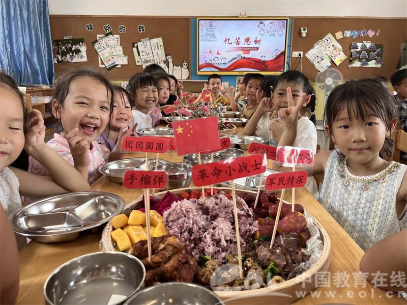 我吹着你吹过的风,我吃着你吃过的饭。9月30日,幼儿园为小朋友提供了一次特殊的午餐“忆苦思甜饭”,老师们向孩子介绍以前的红军叔叔虽然过着艰苦的日子,吃着朴素的饭菜,但他们凭借顽强的意志取得了最终胜利。吃着先辈们吃过的饭,孩子们纷纷表示,我要向红军叔叔学习,不挑食,不怕难,长大要成为建设国家的一份子。