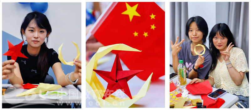 折纸互动环节则让氛围愈发热烈。在视频教学引导下,成员们手持红黄两色折纸材料,认真学习折制象征团圆的纸月亮与代表希望的五角星。指尖翻飞间,原本普通的纸张逐渐变换形态,不少同学还主动分享折纸技巧,互帮互助完成作品,欢声笑语中,团学成员间的距离悄然拉近,团队凝聚力在协作中不断增强。
