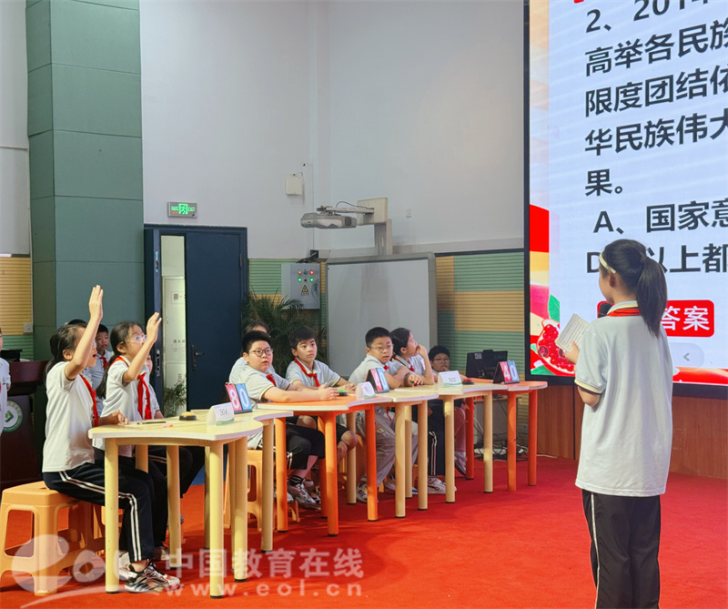 同心石榴聚真情,民族团结谱新篇。一场别开生面的“同心石榴籽 共筑中国梦”民族团结知识竞赛正精彩上演。竞赛现场,五年级各班代表队在你追我赶的必答、抢答与风险题环节中展现出丰富的知识储备与默契的团队配合。