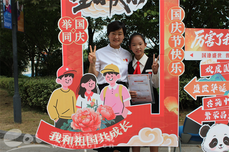 “我和祖国共成长”拍摄环节里,师生们手持小国旗,在印有“76 周年华诞”字样的背景板前定格笑脸,用影像记录与祖国共同成长的珍贵瞬间;随后,大家在兑换点兑换“敬礼章”,这不仅是活动参与的见证,更成为激发少年们爱国热情的“精神信物”。