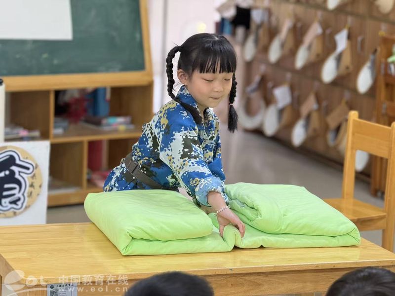 “叠被子也是军人的一项重要技能,我们要把被子叠成方方正正的‘豆腐块’!”教官一边向孩子们讲解叠被子的要领,一边拿起被子进行示范。只见教官先将被子铺平,然后仔细地对折,再用手捏出整齐的线条,不一会儿,一个方方正正的“豆腐块”被子就展现在孩子们眼前。
