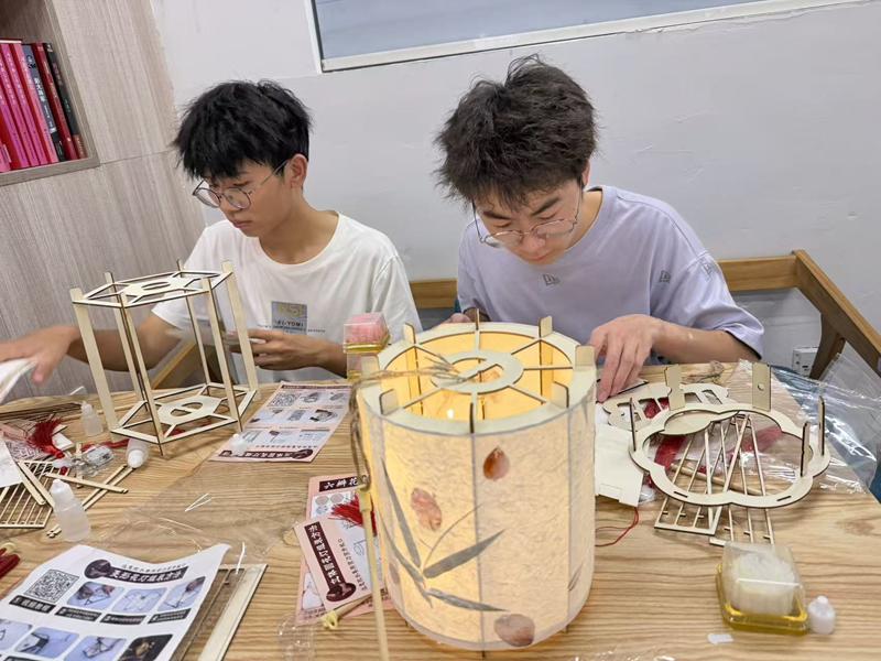 中秋非遗灯笼制作环节于步青学区学生事务中心接续开展。活动现场,长条木板、裁切规整的宣纸、黏合剂、专业画笔及LED照明组件等制作材料分类陈列。参与活动的同学们遵循制作图纸,精准测量木板规格并完成框架拼接,并且运用传统书画技法在宣纸上精心绘制传统纹样。