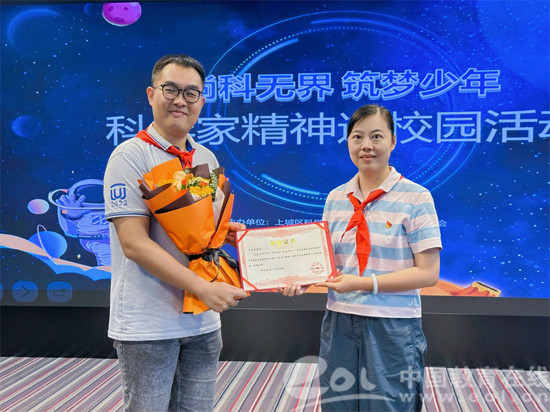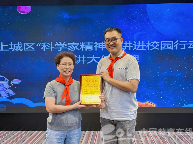 讲座结束后,活动进入授牌与颁奖环节。陈学军代表上城区科协为范迪夏教授授牌,以表彰其在校园科普事业中的积极贡献.随后,陈洁涓为范教授颁发荣誉证书,并共同合影留念,定格这一充满敬意与认可的时刻。