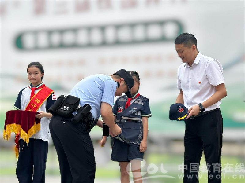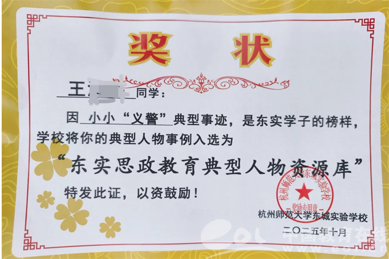 中国教育在线浙江站讯 (编辑 鲁少辛 通讯员 童俊飞)晨光洒满杭州师范大学东城实验学校的操场,10月13日的晨会因一场特殊表彰而格外温暖——406班王同学凭借“主动守护人民币尊严”的正能量举动,收获了全校师生的掌声,九堡派出所余小钦警官专程到场,为这位“小小爱国卫士”授予荣誉、传递肯定,以实际行动践行家校警协同育人使命,为全体师生上了一堂生动的爱国主义实践课。