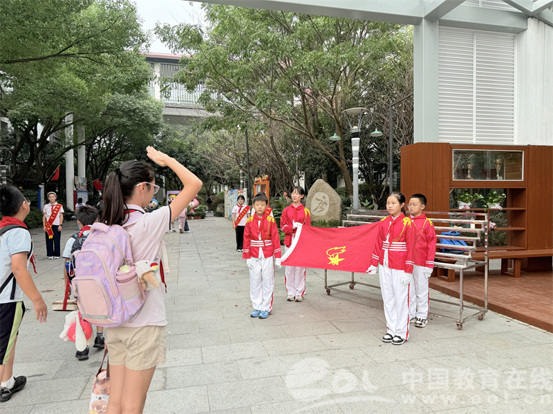 中国教育在线浙江站讯 (编辑 鲁少辛 通讯员 周莹)金秋的阳光洒满校园,鲜艳的大队旗迎风招展。10月13日清晨,北秀小学的队员们怀着激动的心情,在学校正门前庄严列队,向大队旗致以崇高敬礼。同一时刻,各中队教室门口,队员们肃立敬礼,凝视着飘扬的中队旗,目光中满含着对少先队组织的热爱与忠诚。