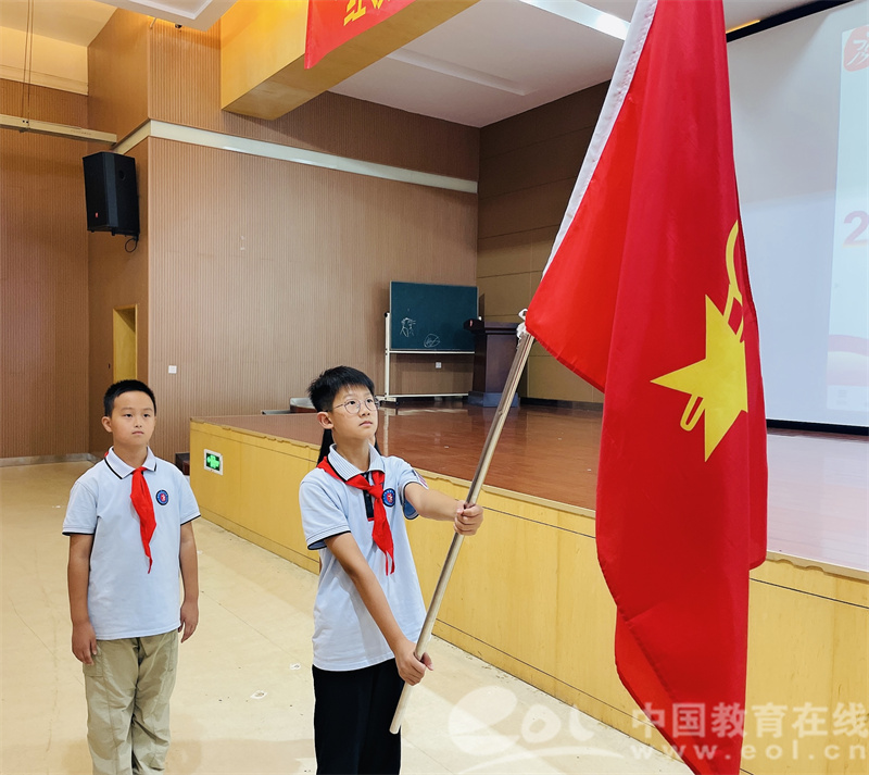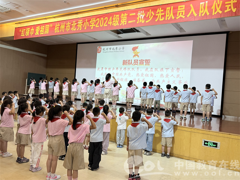 最动人的时刻,是六年级优秀队员郑重地为新队员佩戴上鲜艳的红领巾。这一刻,不仅是荣誉的授予,更是精神的传承。新队员们在大队长方睿的带领下庄严宣誓,铿锵的誓言在报告厅内回响,表达了他们争做新时代好少年的坚定决心。