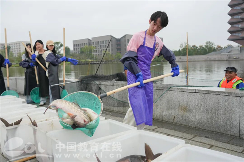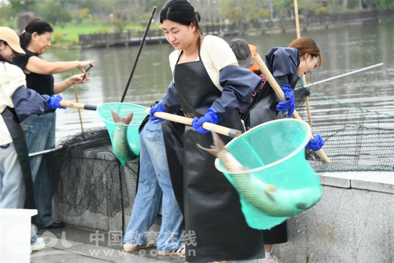 “第一次参加校庆捕鱼,太新奇了!”刚体验完的大一学生张米粒举着网兜笑着说,“亲手捞的鱼能做成宴席,太期待了!”