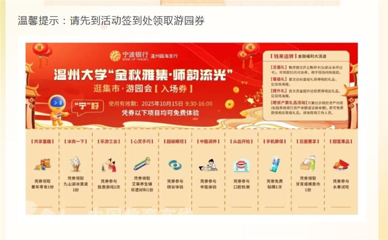 中国教育在线浙江站讯(编辑 陈显婷)秋阳杲杲,温情流淌。10月15日,由温州大学工会妇联与宁波银行温州瓯海支行联合主办的“金秋雅集-师韵流光”校园游园活动圆满落幕。本次活动巧妙地将金融知识普及与传统文化体验、趣味游园互动相结合,为秋日的校园注入了一场别开生面的活力,赢得了在校师生的广泛好评。