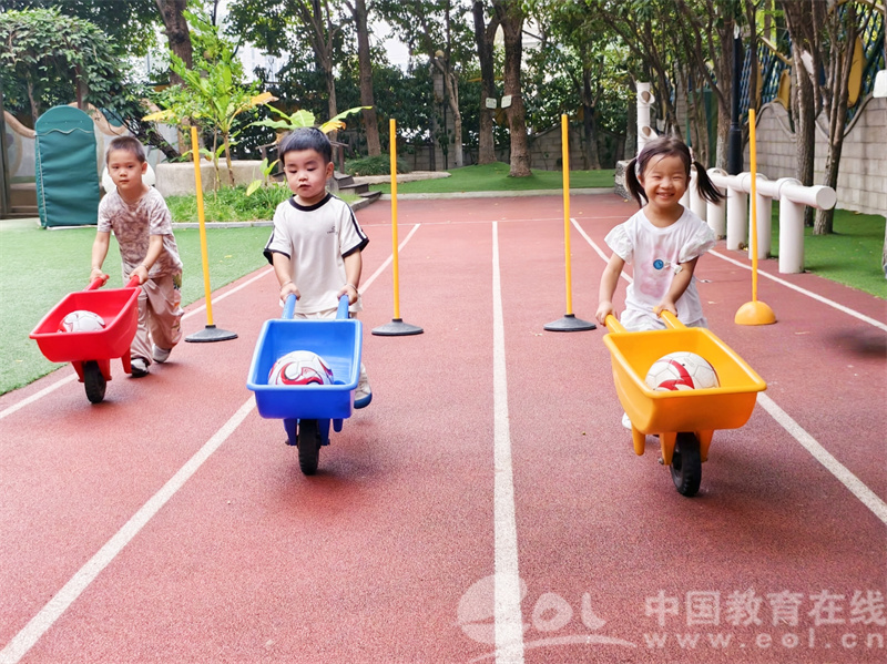 “运粮食”游戏同样精彩。随着教师一声令下,孩子们推着各种“粮食”快步跑向终点,现场欢呼声、加油声不断。通过这场游戏,孩子们在享受乐趣的同时,也体会到运输过程的不易。