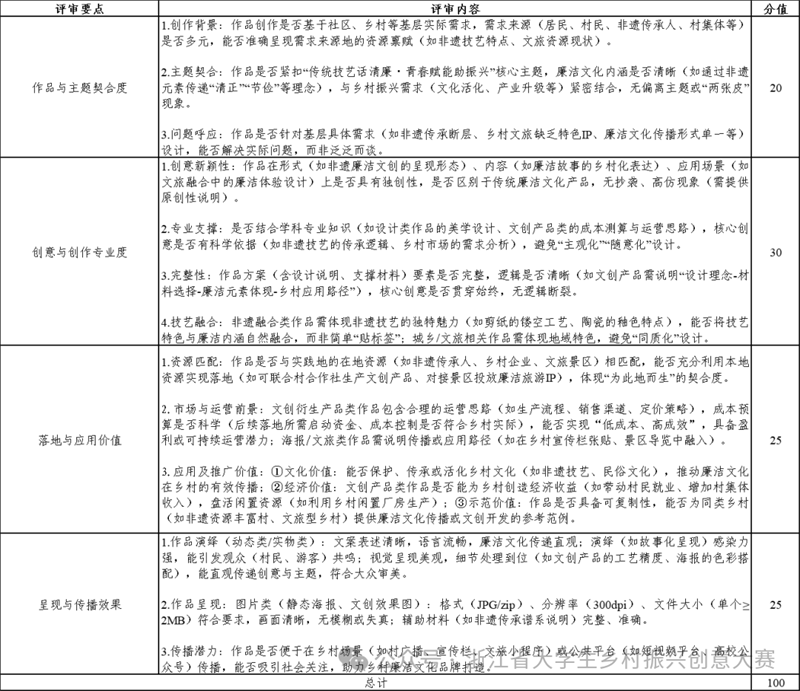 针对违反法律法规或公序良俗,传递消极、低俗价值观;无乡村元素或廉洁文化内涵,完全偏离大赛主题;抄袭、高仿他人作品,或一稿多投,无完整知识产权情况的作品,此项评分按“0分”处理