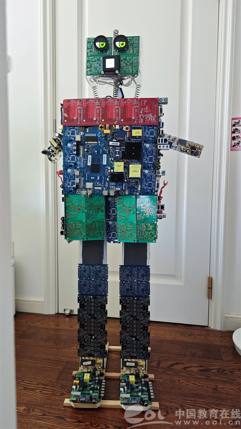 这个机器人是他利用废旧电脑主板、大矿泉水桶、木板等材料,凭借着丰富的想象力和扎实的电路知识制作而成。从外观上看,机器人有着一双炯炯有神的大眼睛,显得十分可爱。而在其内部,复杂精密的电路系统才是真正的“灵魂”所在。张竣熙巧妙地将集成智能对话机嵌入其中,只要开机联网,机器人就能与大家对话,宛如一个小小的“智能伙伴”。在创作过程中,张竣熙也遇到了诸多挑战,比如如何合理布局电路以避免短路,怎样精准调试对话机与机器人的适配性等,但他凭借着不服输的精神,一次次查阅资料、反复试验,最终让“机器人 - 竣熙哥”成功“诞生”。