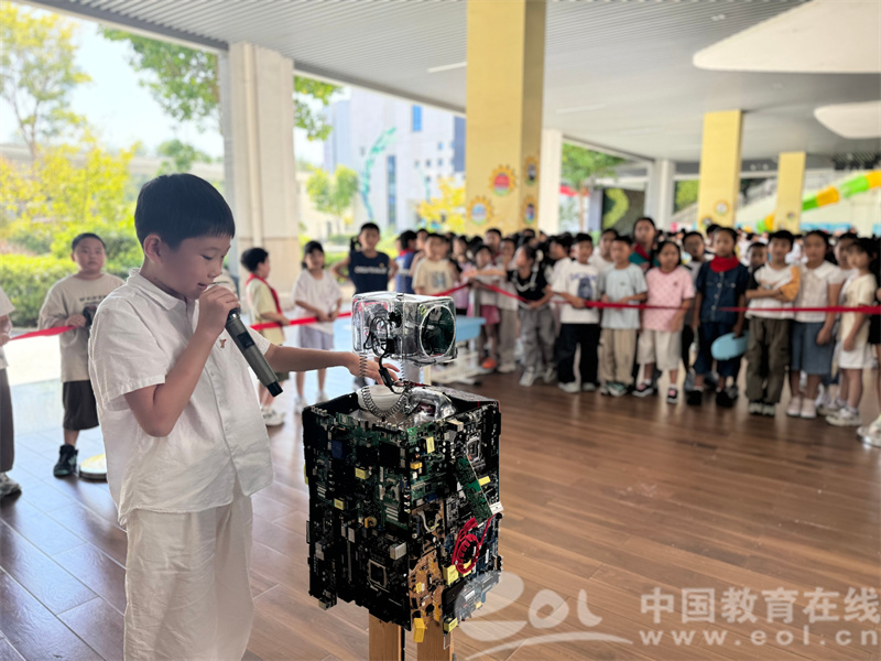 除了机器人,展台上还陈列着张竣熙的其他创意作品,如“洗手+干手器”“智能房屋”“相框电脑”“留声播放机”等。每一件作品都吸引着同学们驻足观看,好奇询问。
