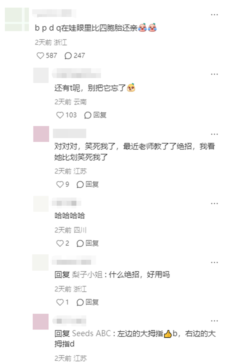 还有一些家长给出了实用的解决方法,比如利用拼音APP增加趣味性,通过游戏化学习降低孩子抵触情绪等。有家长分享了孩子画的pqdb区分图,还有家长建议孩子的身体参与进来。“b举起左手,右手叉腰,d举起右手,左手叉腰。”