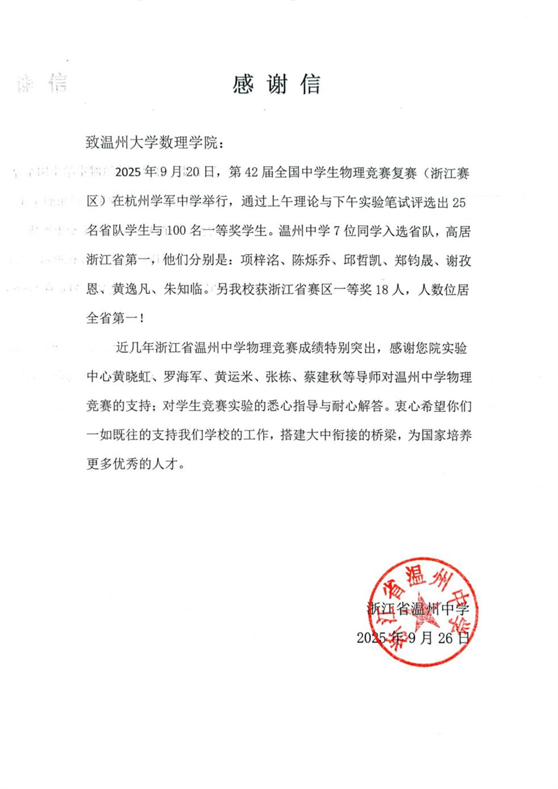 中国教育在线浙江站讯 (编辑 陈显婷 通讯员 叶戴茜)近日,温州大学数理学院再次收到来自浙江省温州中学的感谢信,对学院长期支持物理竞赛辅导工作表示感谢。在刚刚结束的第42届全国中学生物理竞赛复赛(浙江赛区)中,温州中学7名学生入选省队、18名学生获浙江省一等奖,两项成绩均位居全省第一。