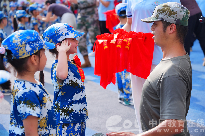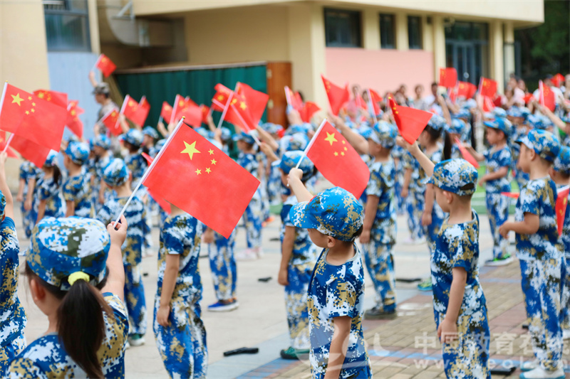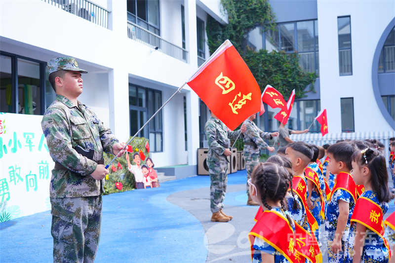 开营仪式上,教官弯腰为幼儿系上绶带时,柔软的布料成了“责任的象征”,不少孩子悄悄攥紧绶带,懵懂中懂得“成为小小兵需有担当”。护旗方队迈着刚劲步伐入场,国歌奏响时,全体幼儿挺直脊背行注目礼,五星红旗冉冉升起的画面,将“爱国”的种子悄悄植入心底。授旗环节中,幼儿代表双手紧握军旗,虽显稚嫩却格外坚定的姿态,让“团结”与“集体”的意识开始萌芽——这些仪式并非形式,而是以幼儿能感知的方式,传递着纪律与信仰的重量。