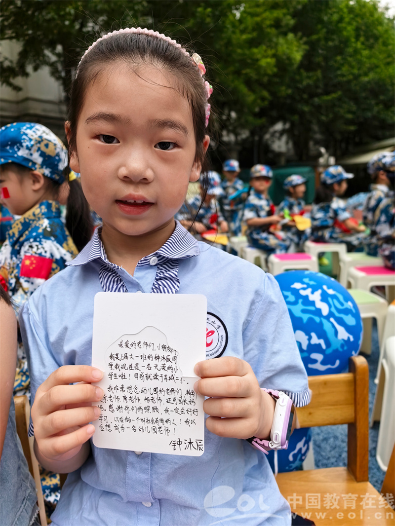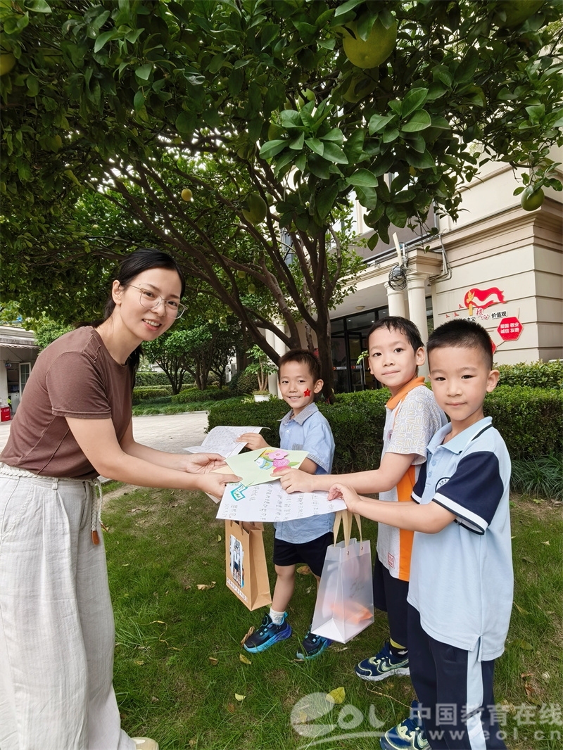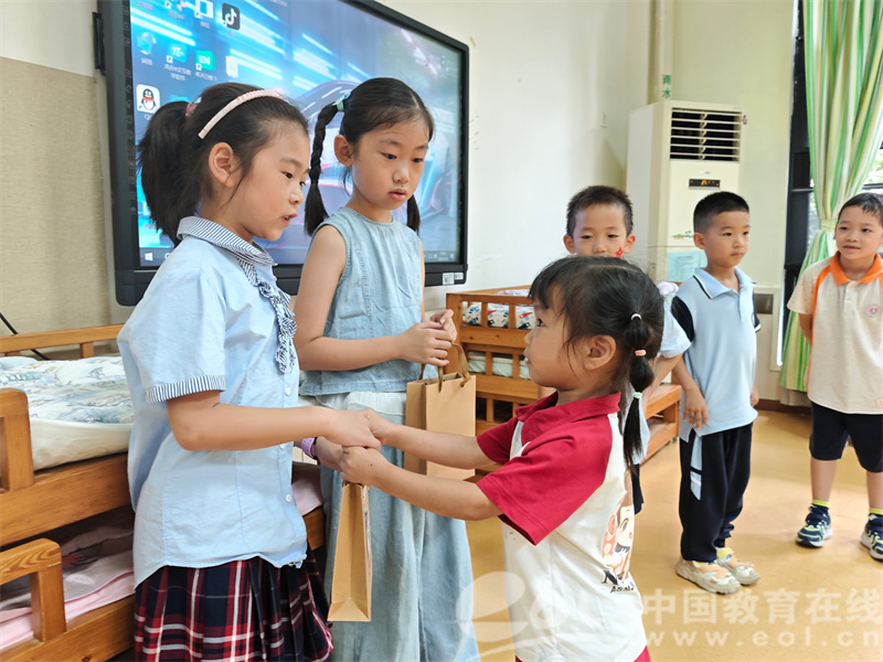 最动人的当属“书信传情”环节。毕业生们拿出提前写好的“悄悄话”纸条,告诉老师“小学的语文课很有趣,我还会背新古诗啦”,有的叮嘱老师“要记得按时吃饭,别总加班”。当老师送上装有小月饼和新园徽的礼物时,糖糖眼眶微红说:“老师,我以后还会回来给您讲故事!”老师说“等幼儿园李子树成熟的时候,你们再来哦”简单的对话中,道尽师幼间的深厚情谊。