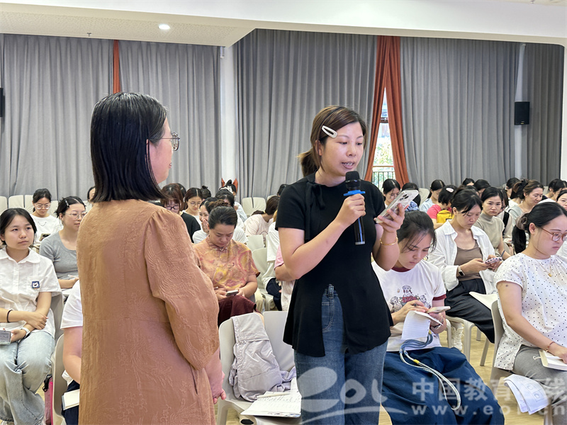 在讲座的互动环节,黄教授围绕“完整儿童”课程中的秋天主题,与现场教师展开了热烈的探讨。她引导大家深入思考三个核心问题,从小、中、大三个年龄段出发,解释了主题脉络的经验逻辑。
