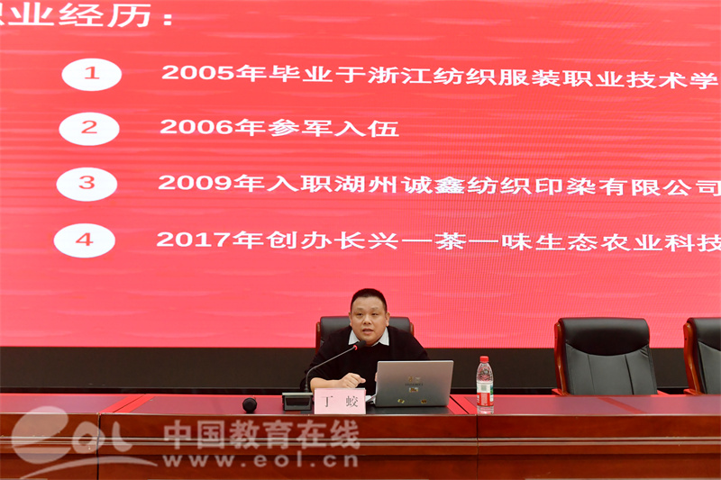 讲座上,丁蛟以“毕业生”与“创业者”双重身份回归母校,分享二十年成长历程。2005年毕业后的他,于2006年参军入伍,两年军旅生涯铸就了“责任与担当”的品格。退伍后,他进入企业担任行政人事经理,积累管理经验,2017年创办“长兴一茶一味生态农业科技有限公司”,开启茶产业创业之路。