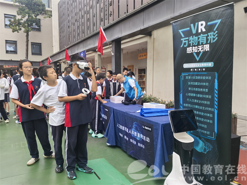 “VR梦境世界”设备前排起长队。VR+AI数字化校园安全科普与VR党建教育设备前,同学们专注度拉满。大家在虚拟现实中排查安全隐患、“穿越”回党史重要节点,枯燥知识变成互动体验,学习兴趣直接拉满。