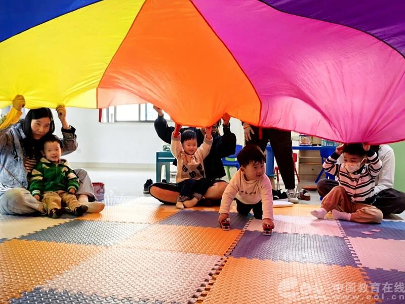 高老师用灵巧的手和可爱的毛绒玩具,将绘本故事演绎得活灵活现,瞬间吸引了所有宝宝的目光,孩子们在童话世界里听得津津有味。在欢快的音乐声中,高老师带领宝宝和家长们一起做音乐律动游戏。“小手拍拍,手指伸出来……”简单的互动不仅锻炼了孩子们的身体协调性,更增进了亲子间的亲密情感。“积木搭搭乐”创意无限,袁老师为孩子们准备了大颗粒软积木。在家长的协助下,宝宝们充分发挥想象力,一座座色彩斑斓的“小城堡”拔地而起,现场充满了创造的乐趣。活动最后,高老师带领大家玩起了经典的“彩虹伞”游戏。随着伞面的起伏,孩子们在下面穿梭、躲藏,欢笑声、惊呼声此起彼伏,将整个活动的气氛推向了高潮。
