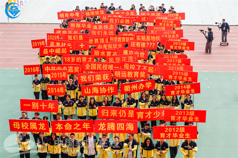 在16支特色方阵中,校友方阵格外引人注目。当一群“大孩子”出现时,看台上响起了热烈的欢呼。400多名校友体现了育才精神的传承——“首届中考,杭城第一(2003届育才毕业生)”“冠军路8号属于育才(2009级育才毕业生)”“建党百年,我们永远跟党走(2021级育才毕业生)”……校友们把自己对育才深厚的情感、无限的感激、满腔的热爱,凝结成最精练的标语,串联起了育才二十五年的发展历程。