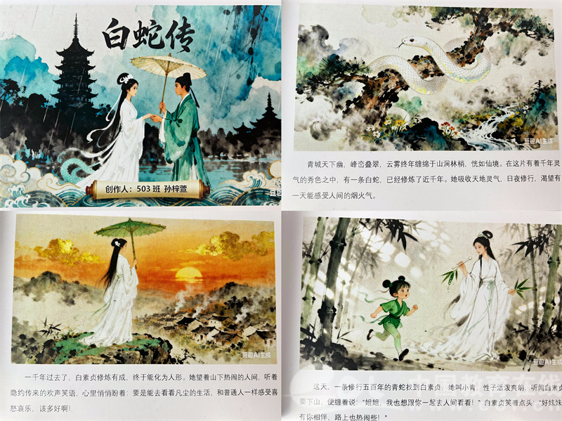 当白娘子的断桥与“AI”的算法相遇,当长城边的孟姜女在数字画笔下熠熠生辉,五年级的同学们徜徉在民间故事的宝库中,他们不仅是忠实的听众,更化身为充满奇思妙想的“创绘家”。他们用敏锐的心灵感受人物悲欢,用巧妙的构思编织情节,更用AI绘图工具这一“数字魔法”,让古老的传说披上了惊艳的新装。