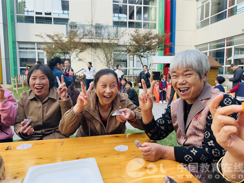 食育工坊飘来阵阵香气。师幼联手制作的重阳糕、南瓜饼甜到心坎,土灶头烧的番薯、毛豆、花生更是“老底子”的温情滋味。精心布置的品尝区里,蒸笼塔冒着热气,爷爷奶奶们吃着美食,眼里满是对童年的怀念,对萌娃的疼爱。