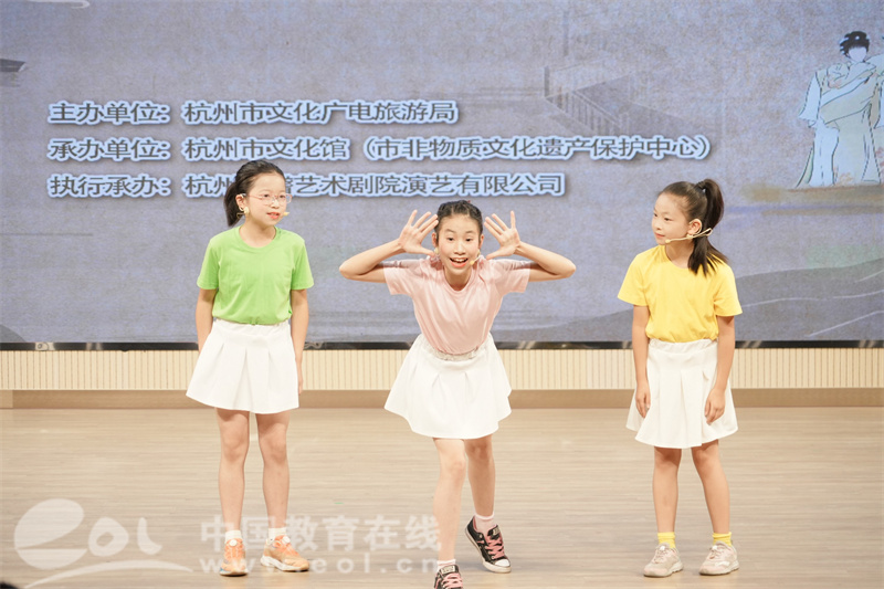 紧接着,杭州滑稽艺术剧院的艺术家们带来了专业演出,国家级“小热昏”代表性传承人徐筱安与杭州滑稽艺术剧院一级演员、“小热昏”市级代表性传承人沈益民合作的双档小热昏《学唱小热昏》、杭州滑稽艺术剧院一级演员、“杭州摊簧”市级代表性传承人梁雪与二级演员、“杭州摊簧”市级代表性传承人潘婷共同表演的杭州摊簧《望海潮》等经典曲艺作品,让孩子们眼前一亮,特别是地道的杭州方言与诙谐的表演风格相得益彰,引得现场笑声不断。